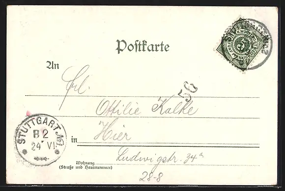Personenbezogene Daten auf der Rückseite der Karte wurden durch blauen Textmarker unkenntlich gemacht. Die blauen Stellen sind auf die Vorderseite durchgeweicht und wirken sich negativ auf das Postkartenfoto aus