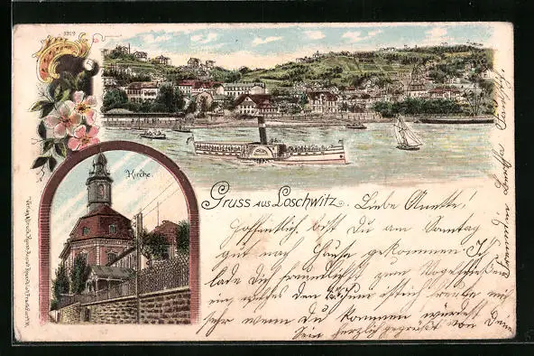 Lithographie Loschwitz, Teilansicht mit Dampfer, Kirche