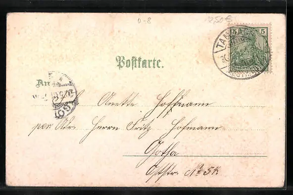 Personenbezogene Daten auf der Rückseite der Karte wurden durch blauen Textmarker unkenntlich gemacht. Die blauen Stellen sind auf die Vorderseite durchgeweicht und wirken sich negativ auf das Postkartenfoto aus