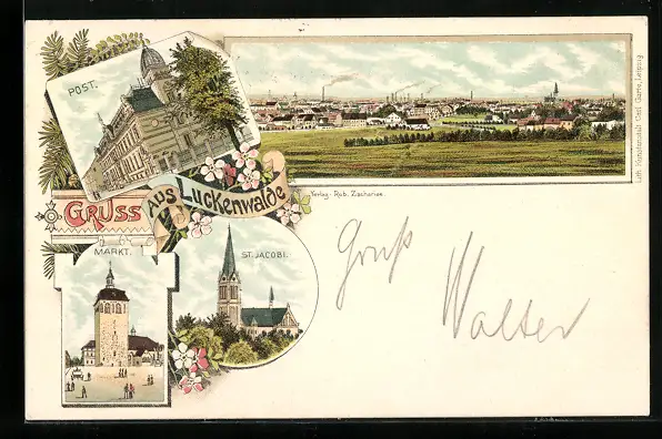 Lithographie Luckenwalde, Kirche St. Jacobi, Post, Markt
