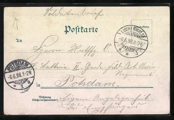 Personenbezogene Daten auf der Rückseite der Karte wurden durch blauen Textmarker unkenntlich gemacht. Die blauen Stellen sind auf die Vorderseite durchgeweicht und wirken sich negativ auf das Postkartenfoto aus