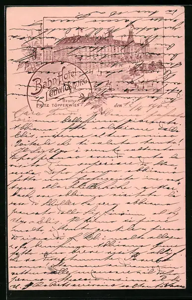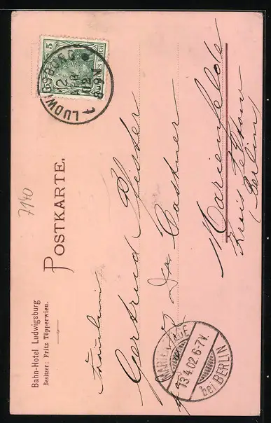 Personenbezogene Daten auf der Rückseite der Karte wurden durch blauen Textmarker unkenntlich gemacht. Die blauen Stellen sind auf die Vorderseite durchgeweicht und wirken sich negativ auf das Postkartenfoto aus