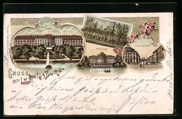 Lithographie Ludwigsburg, Schloss, Monrepos, Myliusstrasse