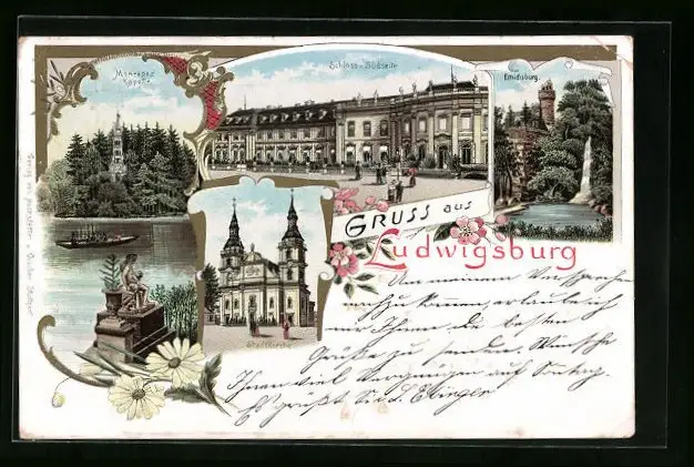 Lithographie Ludwigsburg, Stadtkirche, Schloss, Monrepos Kapelle