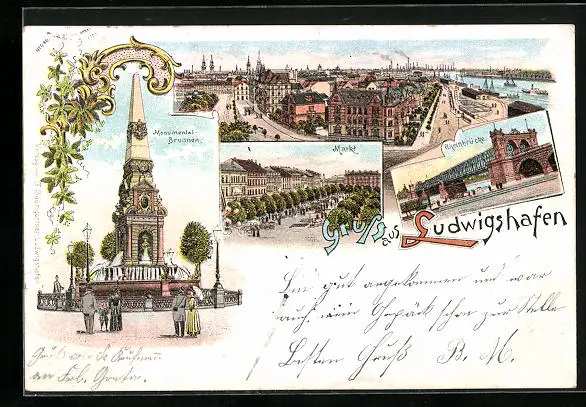 Lithographie Ludwigshafen, Markt, Monumentalbrunnen, Rheinbrücke, Teilansicht