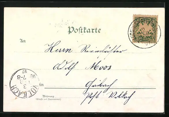Personenbezogene Daten auf der Rückseite der Karte wurden durch blauen Textmarker unkenntlich gemacht. Die blauen Stellen sind auf die Vorderseite durchgeweicht und wirken sich negativ auf das Postkartenfoto aus