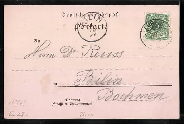 Personenbezogene Daten auf der Rückseite der Karte wurden durch blauen Textmarker unkenntlich gemacht. Die blauen Stellen sind auf die Vorderseite durchgeweicht und wirken sich negativ auf das Postkartenfoto aus