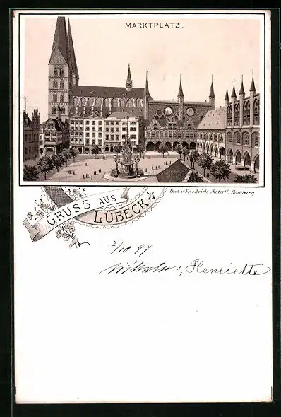 Lithographie Lübeck, Marktplatz mit Springbrunnen