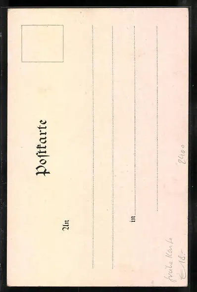 Personenbezogene Daten auf der Rückseite der Karte wurden durch blauen Textmarker unkenntlich gemacht. Die blauen Stellen sind auf die Vorderseite durchgeweicht und wirken sich negativ auf das Postkartenfoto aus