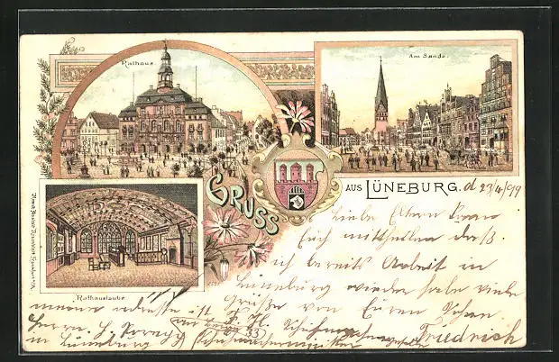 Lithographie Lüneburg, Rathaus, Sam Sande, Rathauslaube