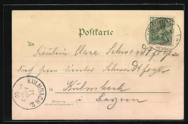 Personenbezogene Daten auf der Rückseite der Karte wurden durch blauen Textmarker unkenntlich gemacht. Die blauen Stellen sind auf die Vorderseite durchgeweicht und wirken sich negativ auf das Postkartenfoto aus