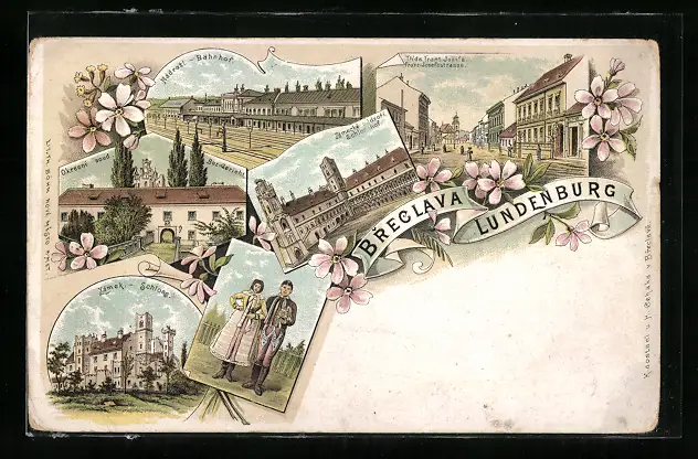 Lithographie Lundenburg, Nádrani, Zámek, Okresni soud, Trida Frant-Josefa