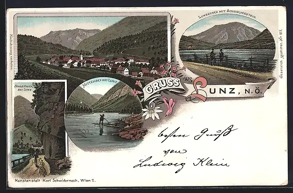 Lithographie Lunz /N. Ö., Lunzersee mit Scheiblingstein, Mittersee, Hohle Mauer