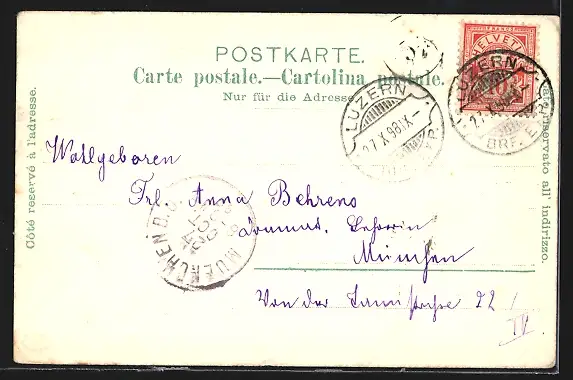 gelaufen 1898, Eckknick li. oben, Bugspur re. unten, guter Zustand