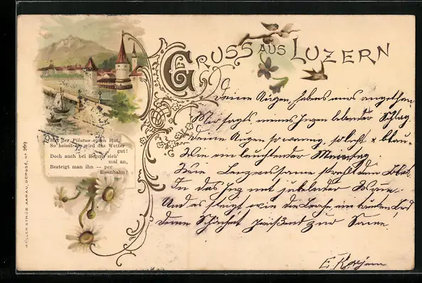Lithographie Luzern, Segelboote vor Ort, mit Gedicht