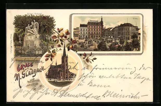 Lithographie M.-Gladbach, Kirche, Platz, Krieger-Denkmal