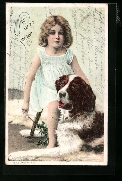 Lithographie Mädchen mit liegendem Bernhardiner