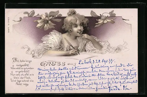 Lithographie Mädchen schreibt einen Brief, Aufforderung an Schreibfaule
