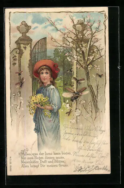 Lithographie Mädchen und fliegende Maikäfer vor einem Tor