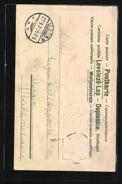 Personenbezogene Daten auf der Rückseite der Karte wurden durch blauen Textmarker unkenntlich gemacht. Die blauen Stellen sind auf die Vorderseite durchgeweicht und wirken sich negativ auf das Postkartenfoto aus