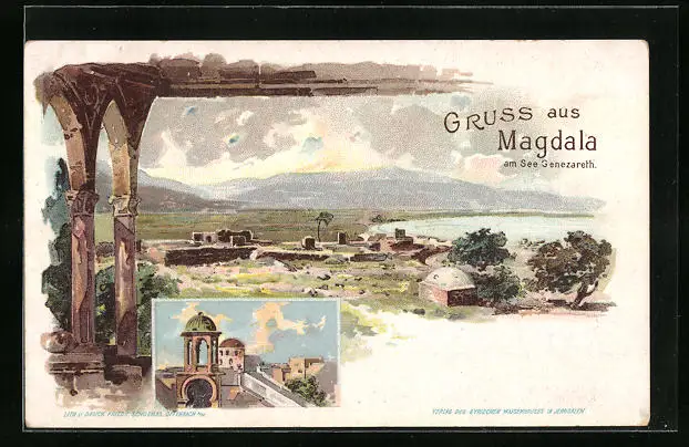Lithographie Magdala am See Genezareth, Panorama, Ortspartie