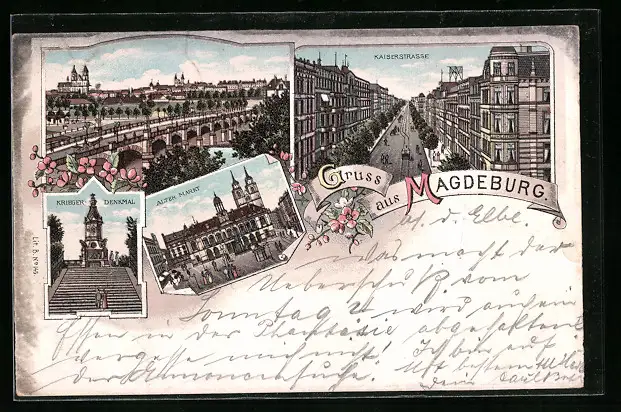 Lithographie Magdeburg, Alter Markt, Krieger-Denkmal, Kaiserstrasse