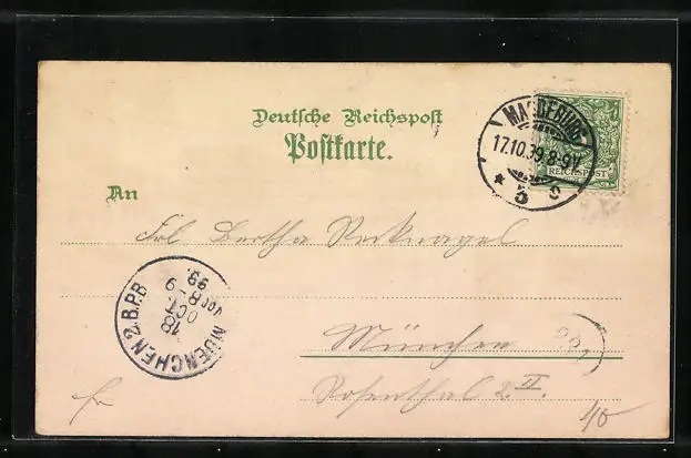 Personenbezogene Daten auf der Rückseite der Karte wurden durch blauen Textmarker unkenntlich gemacht. Die blauen Stellen sind auf die Vorderseite durchgeweicht und wirken sich negativ auf das Postkartenfoto aus