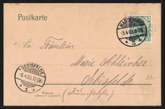 Personenbezogene Daten auf der Rückseite der Karte wurden durch blauen Textmarker unkenntlich gemacht. Die blauen Stellen sind auf die Vorderseite durchgeweicht und wirken sich negativ auf das Postkartenfoto aus