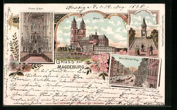 Lithographie Magdeburg, Dom, Kriegerdenkmal, Der Breite Weg
