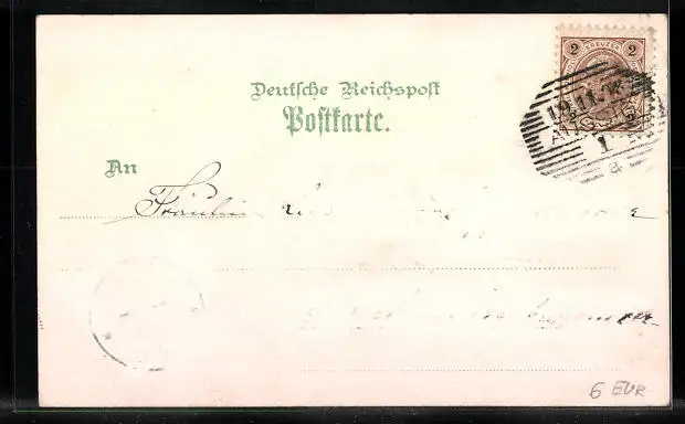 Personenbezogene Daten auf der Rückseite der Karte wurden durch blauen Textmarker unkenntlich gemacht. Die blauen Stellen sind auf die Vorderseite durchgeweicht und wirken sich negativ auf das Postkartenfoto aus