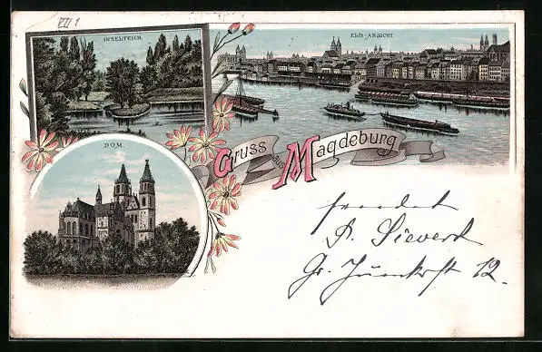 Lithographie Magdeburg, Elb-Ansicht mit Booten, Dom, Inselteich