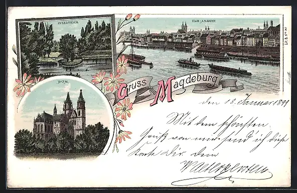 Lithographie Magdeburg, Elb-Ansicht mit Booten, Dom, Inselteich