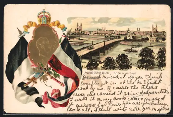 Lithographie Magdeburg, Gesamtansicht, Reichsflagge und Porträt Kaiser Wilhelm II.