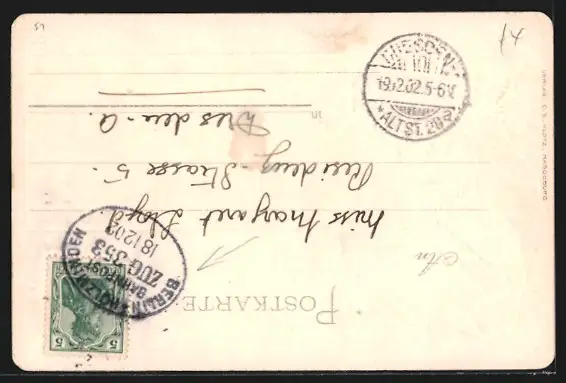 Personenbezogene Daten auf der Rückseite der Karte wurden durch blauen Textmarker unkenntlich gemacht. Die blauen Stellen sind auf die Vorderseite durchgeweicht und wirken sich negativ auf das Postkartenfoto aus