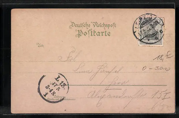 Personenbezogene Daten auf der Rückseite der Karte wurden durch blauen Textmarker unkenntlich gemacht. Die blauen Stellen sind auf die Vorderseite durchgeweicht und wirken sich negativ auf das Postkartenfoto aus