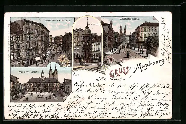 Lithographie Magdeburg, Kaiser Otto, Der alte Markt, Neue Jacob-Strasse