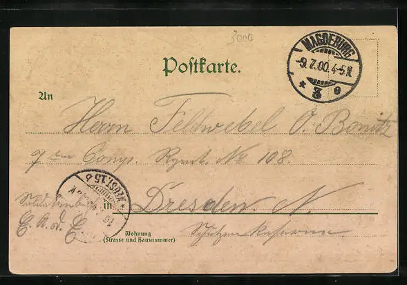 gelaufen 1900 als Feldpost, Eckknicke oben u. unten re., guter Zustand