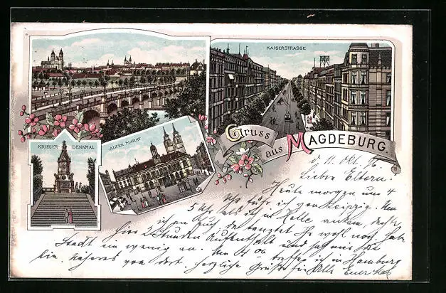 Lithographie Magdeburg, Kaiserstrasse, Alter Markt, Krieger-Denkmal