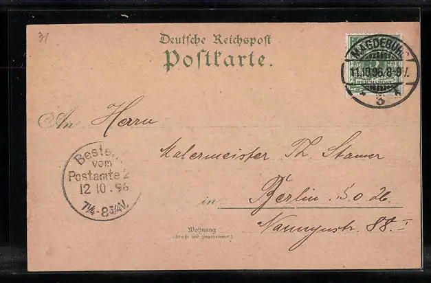 Personenbezogene Daten auf der Rückseite der Karte wurden durch blauen Textmarker unkenntlich gemacht. Die blauen Stellen sind auf die Vorderseite durchgeweicht und wirken sich negativ auf das Postkartenfoto aus