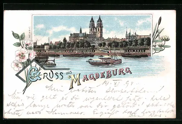 Lithographie Magdeburg, Uferpartie mit Dom