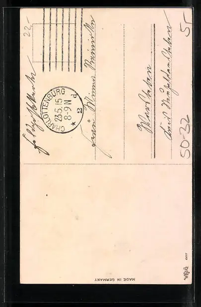 Personenbezogene Daten auf der Rückseite der Karte wurden durch blauen Textmarker unkenntlich gemacht. Die blauen Stellen sind auf die Vorderseite durchgeweicht und wirken sich negativ auf das Postkartenfoto aus