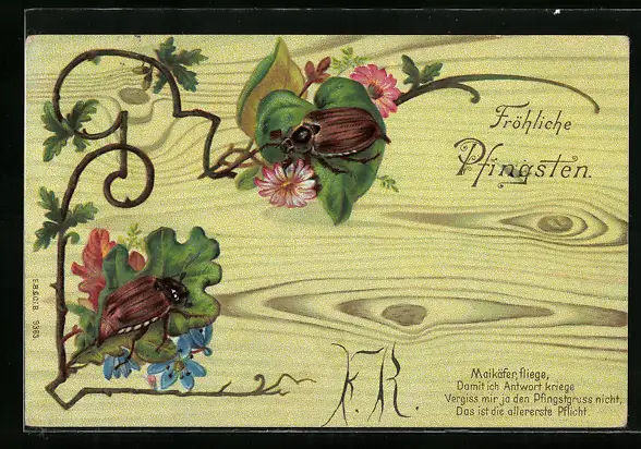 Lithographie Maikäfer auf Blättern, Pfingstgruss