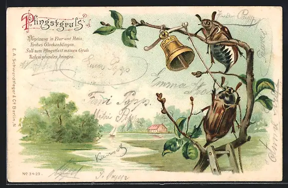 Lithographie Maikäfer auf einem Baum läuten ein Glöckchen, Pfingstgruss