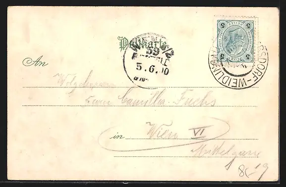 Personenbezogene Daten auf der Rückseite der Karte wurden durch blauen Textmarker unkenntlich gemacht. Die blauen Stellen sind auf die Vorderseite durchgeweicht und wirken sich negativ auf das Postkartenfoto aus