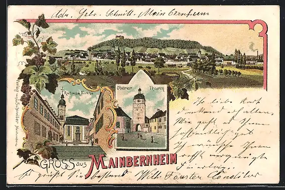 Lithographie Mainbernheim, Gesamtansicht, Rathaus. Kirche, Oberer Turm