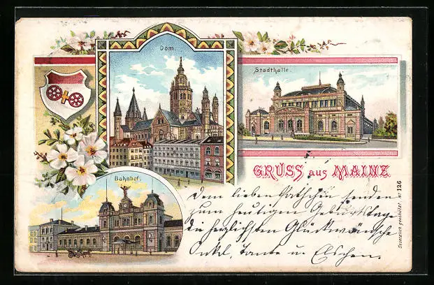 Lithographie Mainz, Bahnhof, Stadthalle, Dom, Wappen