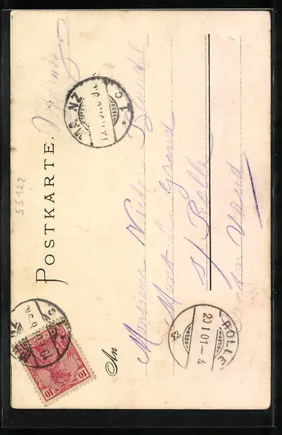 Personenbezogene Daten auf der Rückseite der Karte wurden durch blauen Textmarker unkenntlich gemacht. Die blauen Stellen sind auf die Vorderseite durchgeweicht und wirken sich negativ auf das Postkartenfoto aus