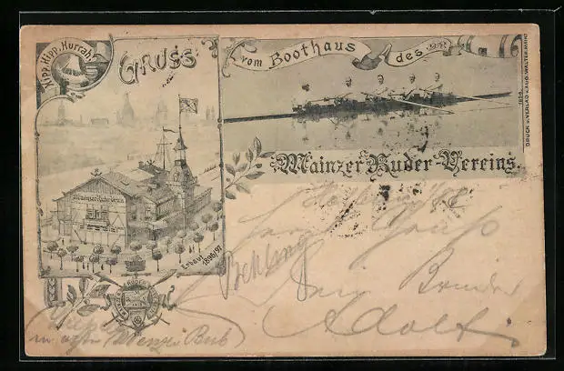 Lithographie Mainz, Bootshaus des Mainzer Ruder-Vereins