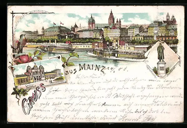 Lithographie Mainz, Central-Bahnhof, Gutenberg-Denkmal, Panorama