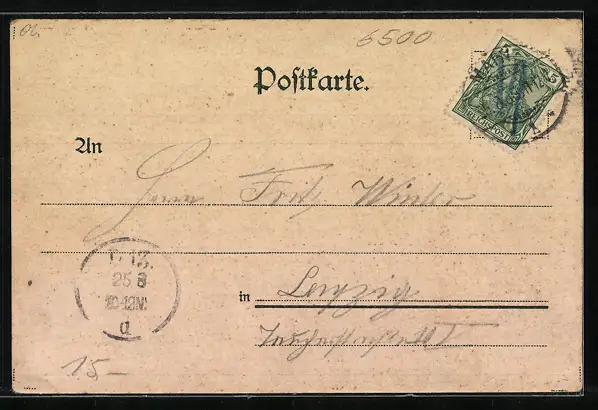 Personenbezogene Daten auf der Rückseite der Karte wurden durch blauen Textmarker unkenntlich gemacht. Die blauen Stellen sind auf die Vorderseite durchgeweicht und wirken sich negativ auf das Postkartenfoto aus